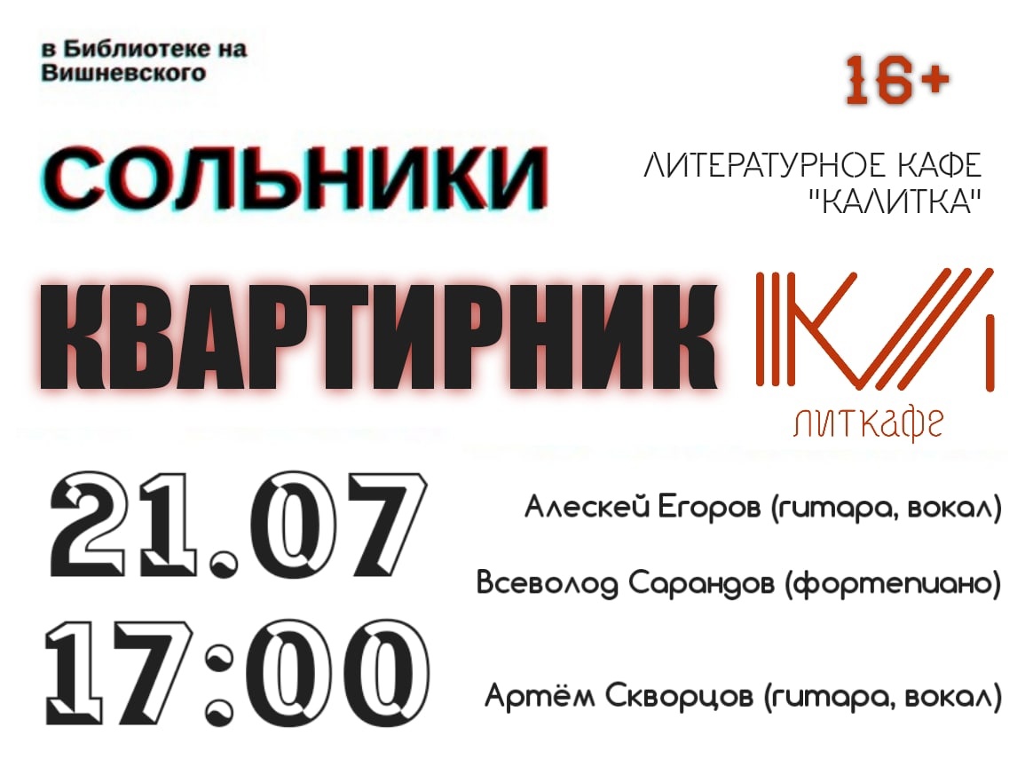 В рамках проекта "Сольники на Вишневского" в Центральной библиотеке пройдёт самый настоящий квартирник. Мероприятие состоится в уникальной локации библиотеки: Литературное кафе "КаЛитКа". Участниками квартирника станут: Алескей Егоров (гитара, вокал), Всеволод Сарандов (фортепиано), Артём Скворцов (гитара, вокал).